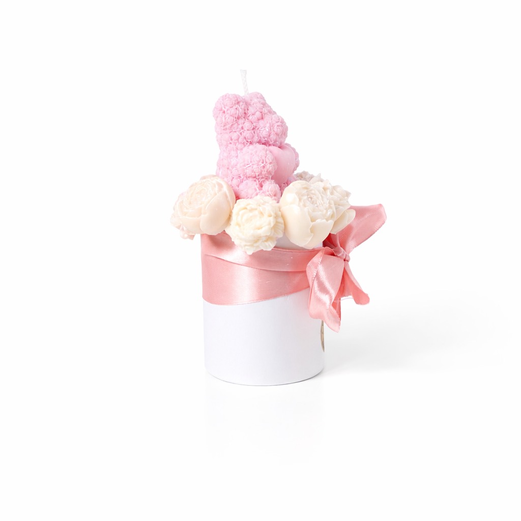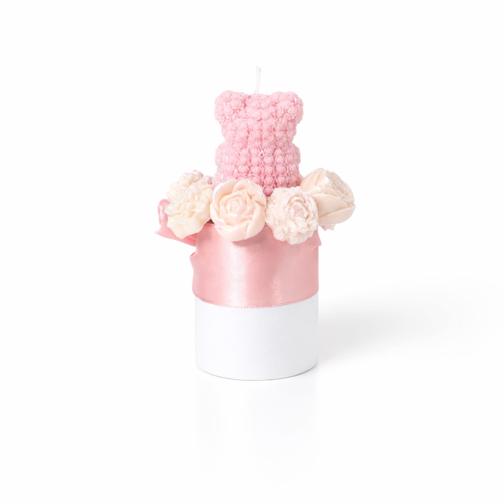 Ourson de Cire & Fleurs Sculptées rose en soja végétale, Vegan, sans OGM et parfumé au cuberdon, fait main pour une décoration douce et naturelle.