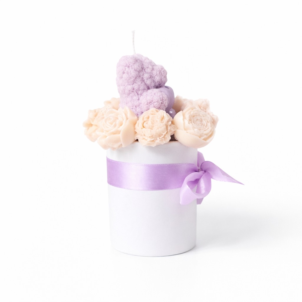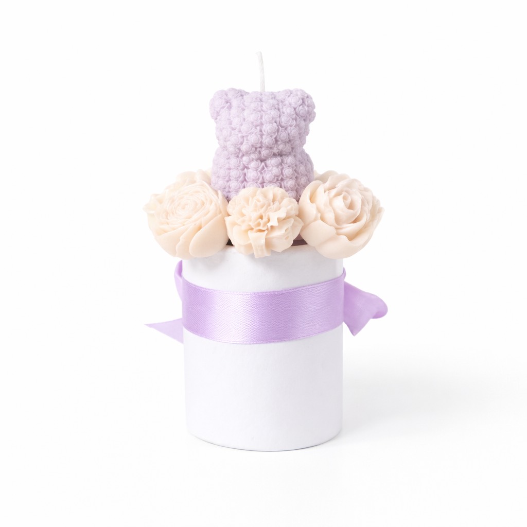Ourson de Cire & Fleurs Sculptées violet en soja végétale, Vegan, sans OGM et parfumé au cuberdon, fait main pour une décoration douce et naturelle.